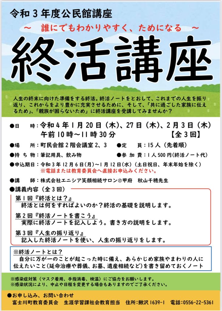 昨年度に引き続き生まれ育った町富士川町で終活講座の講師を務めさせていただきました。